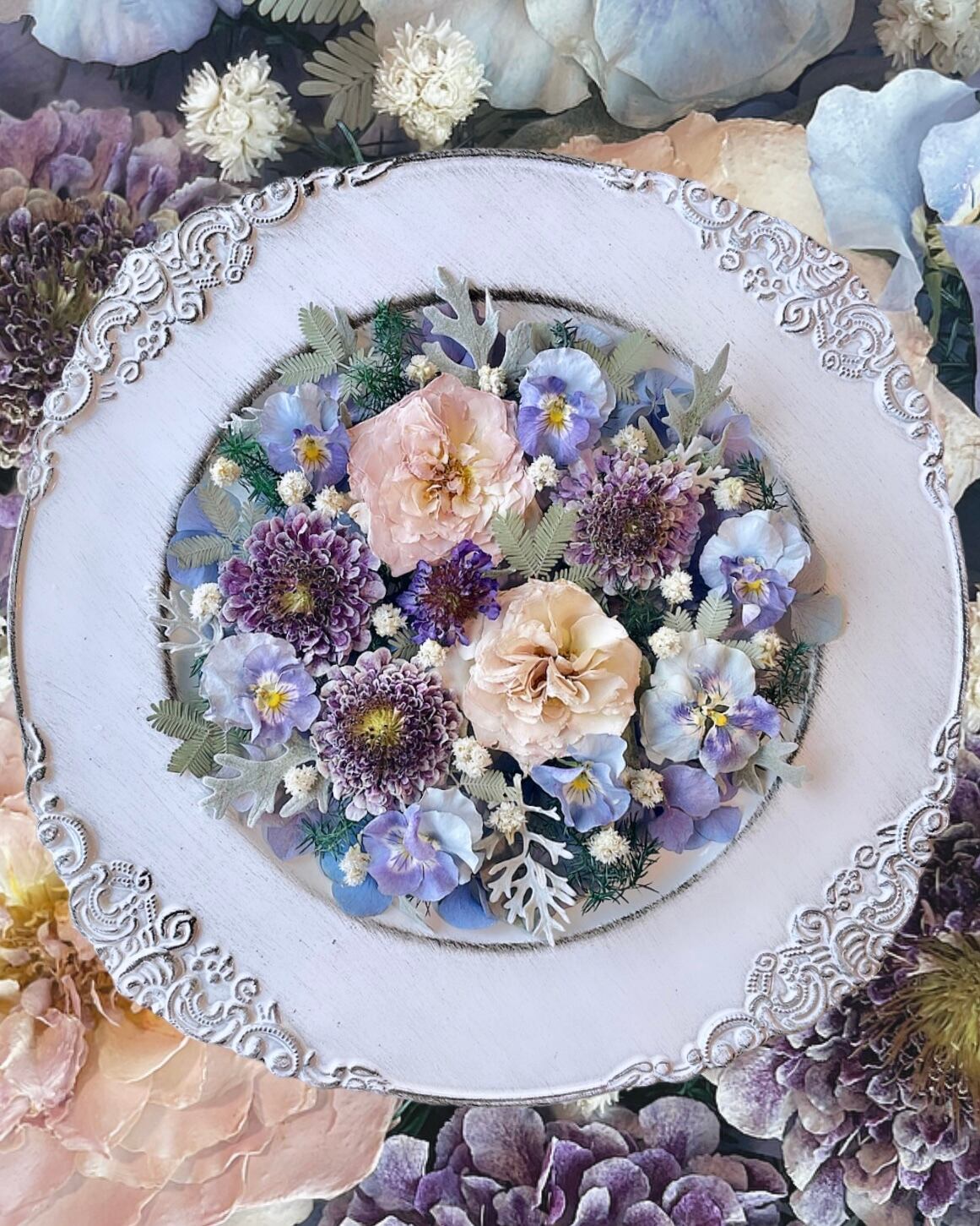ダスティブルー花材セット。リボンプレゼント中。